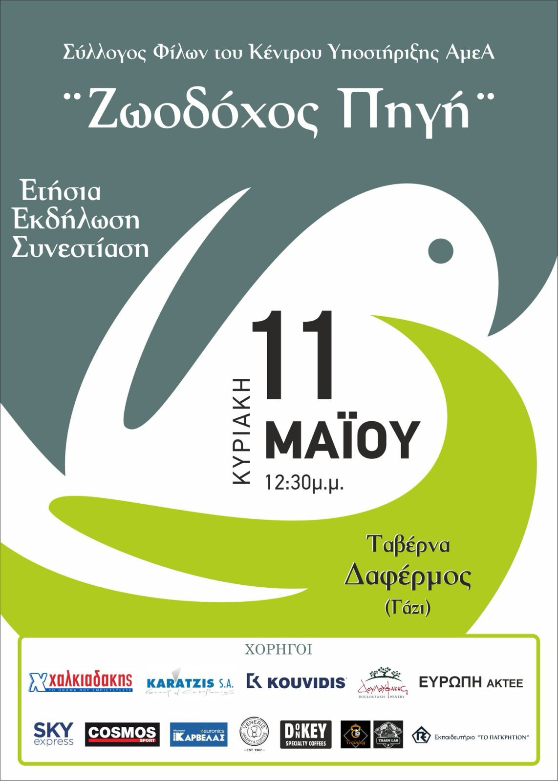 Ο Σύλλογος Φίλων του Κέντρου Υποστήριξης ΑμεΑ «Η ΖΩΟΔΟΧΟΣ ΠΗΓΗ», σας προσκαλεί στην εκδήλωση που θα πραγματοποιηθεί στην Ταβέρνα "Δαφέρμος" (Τσαλικάκι, Γάζι) το μεσημέρι της Κυριακής 11 Μαΐου 2025 και ώρα 12:30 μ.μ.